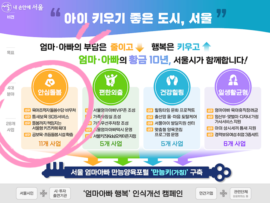 서울시에서도 엄마아빠 행복프로젝트라는 조부모돌봄수당 지원을 신설했다. 서울시는 서울형 안심돌봄이라는 타이틀로 해당 프로젝트를 기획하면서 그 중 조부모돌봄수당은 아이돌봄비 지원에 해당하며 조부모 등 4촌 이내 친인척에서 아이를 맡기는 경우 아이 1명 당 월 30만 원의 돌봄수당을 지원한다.