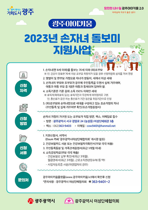 조부모의 돌봄가치를 인정하고 양육비를 줄이는데 도움을 주고자 전국에서 처음으로 광주광역시는 2011년부터 손자녀 돌보미 지원사업을 시행해오고 있다. 또한 2023년에는 그 지원 사업을 더 확대해오고 있다. 기존 3억 원의 지원규모액에서 6억 원까지 예산을 늘리고 쌍둥이와 자녀가 3명 이상의 다둥이 가정에서 한부모가정까지 포함해 대상 역시 확대한다. 8시간 이상인 경우 월 25만 원에서 30만 원으로 4시간 이상인 경우 월 10만 원에서 20만 원으로 조부모의 손주돌봄수당도 확대했다.
